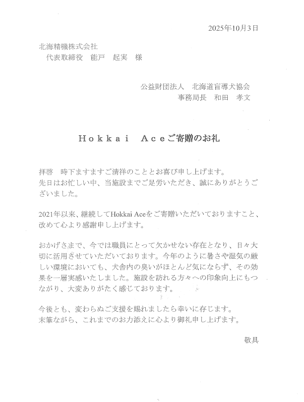 お礼とHOKKAI Aceの感想をいただきました。